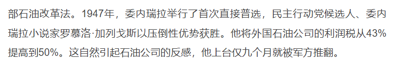 所以我说了,国内的文科水平,简直没法看,什么民主啊开放啊,你们说的这些,委内瑞拉本土知识分子又不是不知道,加列戈斯他们1947年就意识到问题了,但没办法,人家隔壁真的有美军,你一加税,人家直接给你桌子掀了。