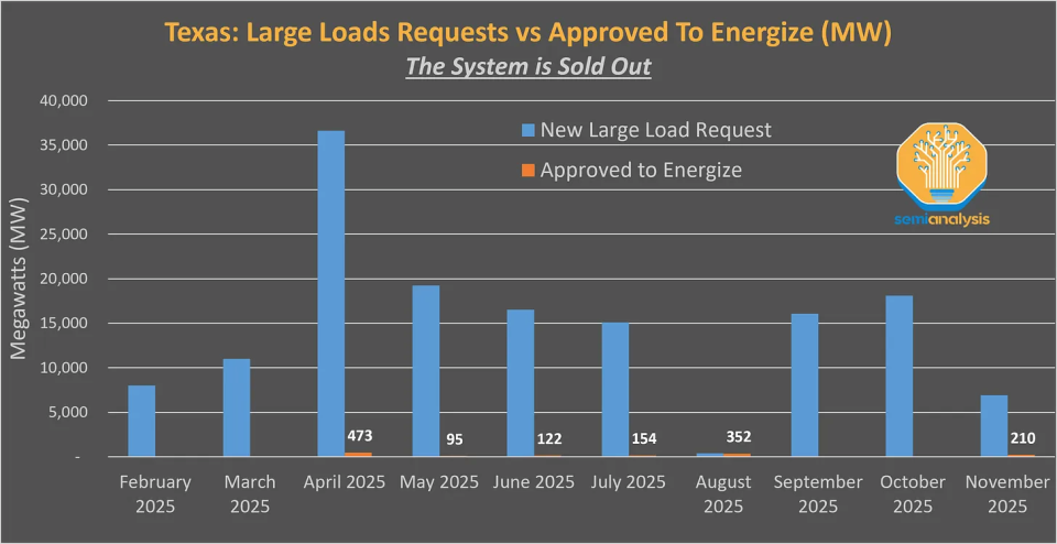 SemiAnalysis的跟踪数据显示,目前在得克萨斯州,每个月都有几十吉瓦的数据中心用电申请,但电网能批下来的只有1吉瓦出头。