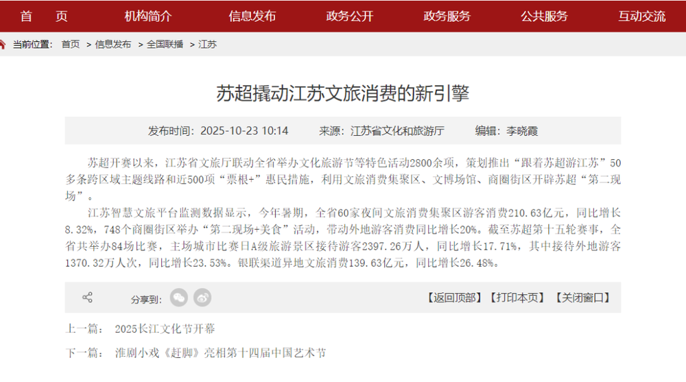 你们可以去看江苏省文旅厅的简报,标题就是“苏超撬动江苏文旅消费的新引擎”: