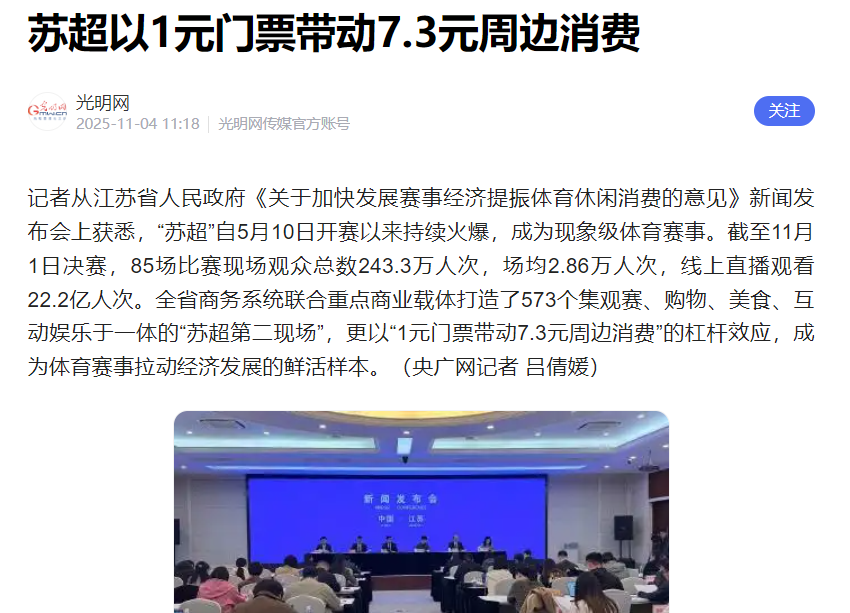 江苏商务厅讲得更直接——苏超以1元门票带动7.3元周边消费。