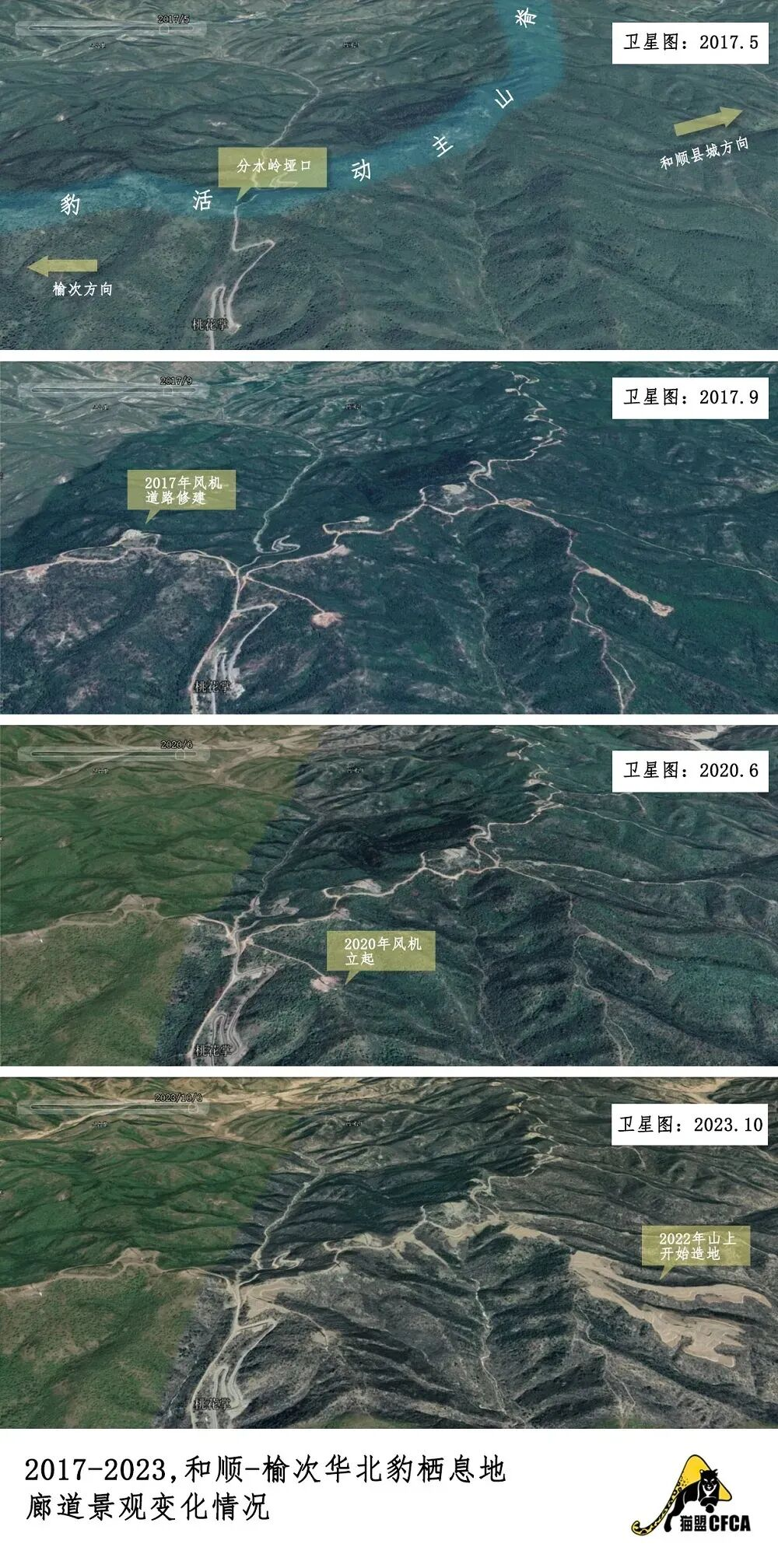 风电和造地造成的栖息地破碎化卫星影像变化图