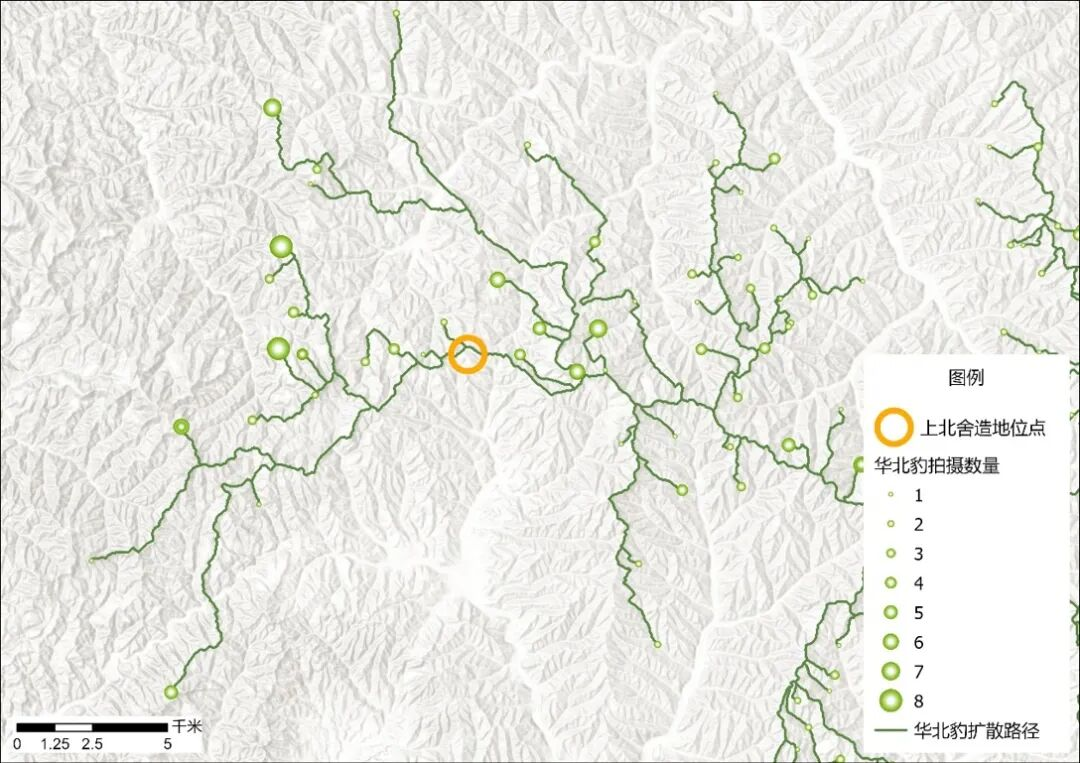 从更大的尺度看,上北舍位于和顺-榆次片区华北豹迁移扩散的关键节点上。这里连接着铁桥山与八缚岭两大保护区,是东西向栖息地之间唯一连续的山脊通道。若以科学术语描述,这里是扩散的“最小成本路径”,即对豹的扩散而言,上北舍的山岭是豹的必经之路。历代“豹王”M2、M4、M13、M16,都曾跨越这道分水岭垭口,拓展自己的版图。