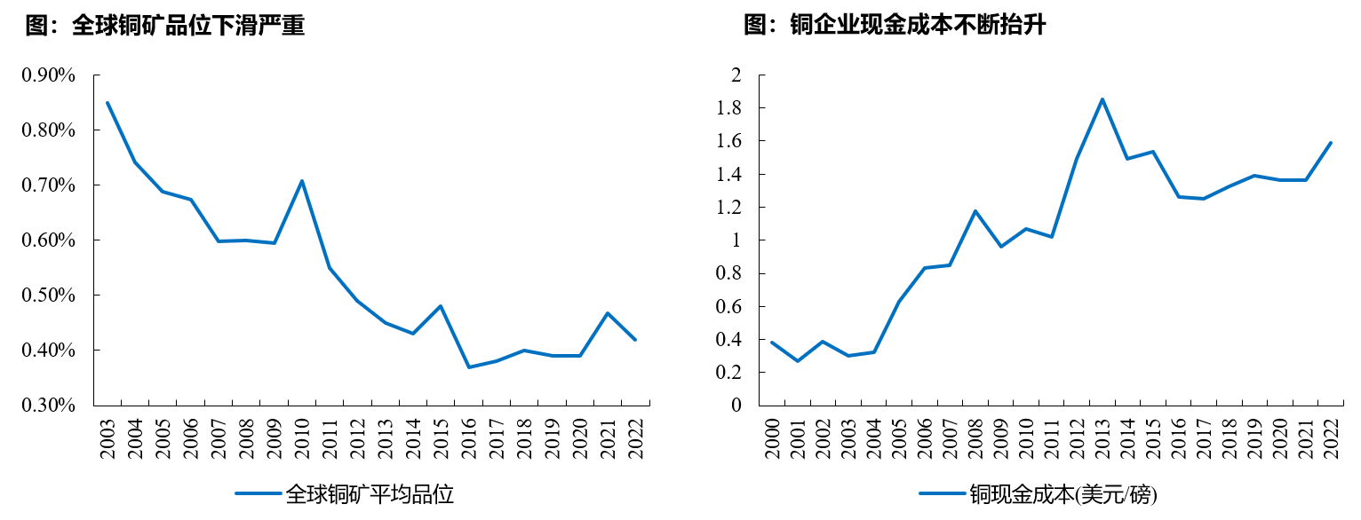 铜矿供给端存在多重约束。一是开发周期很长、资金门槛高,投资回报周期长,品位下降(全球平均品位从2003年的0.85%降至2022年的0.42%)也在推高开发成本,这就导致前期资本开支不足、新增产能跟不上;