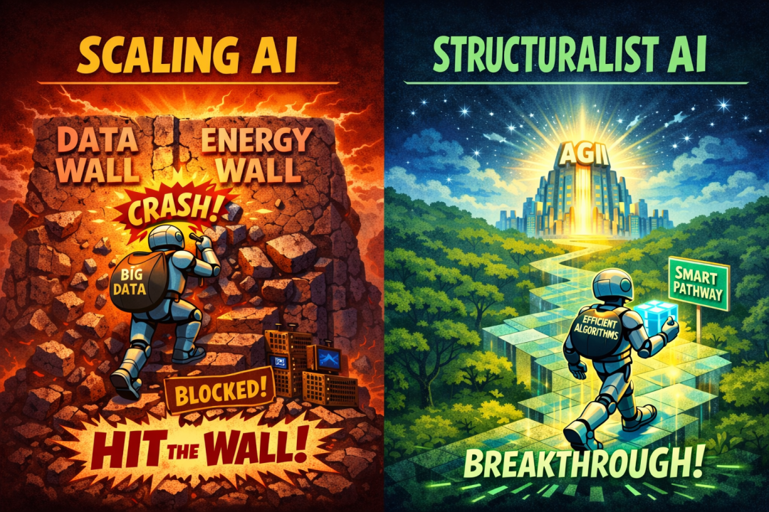 图注:刘子鸣在2025年12月25日写的博客《Achieving AGI Intelligently–Structure,Not Scale》中,提出“结构主义人工智能是不可避免的超越扩展路径——不是因为扩展错了,而是因为它最终会撞上能量/数据的瓶颈”。
