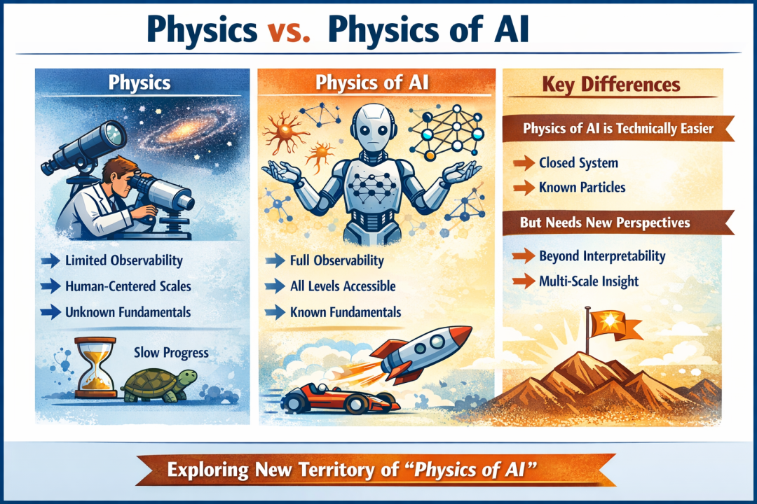 图注:物理学和(人工智能的)物理学的区别示意图