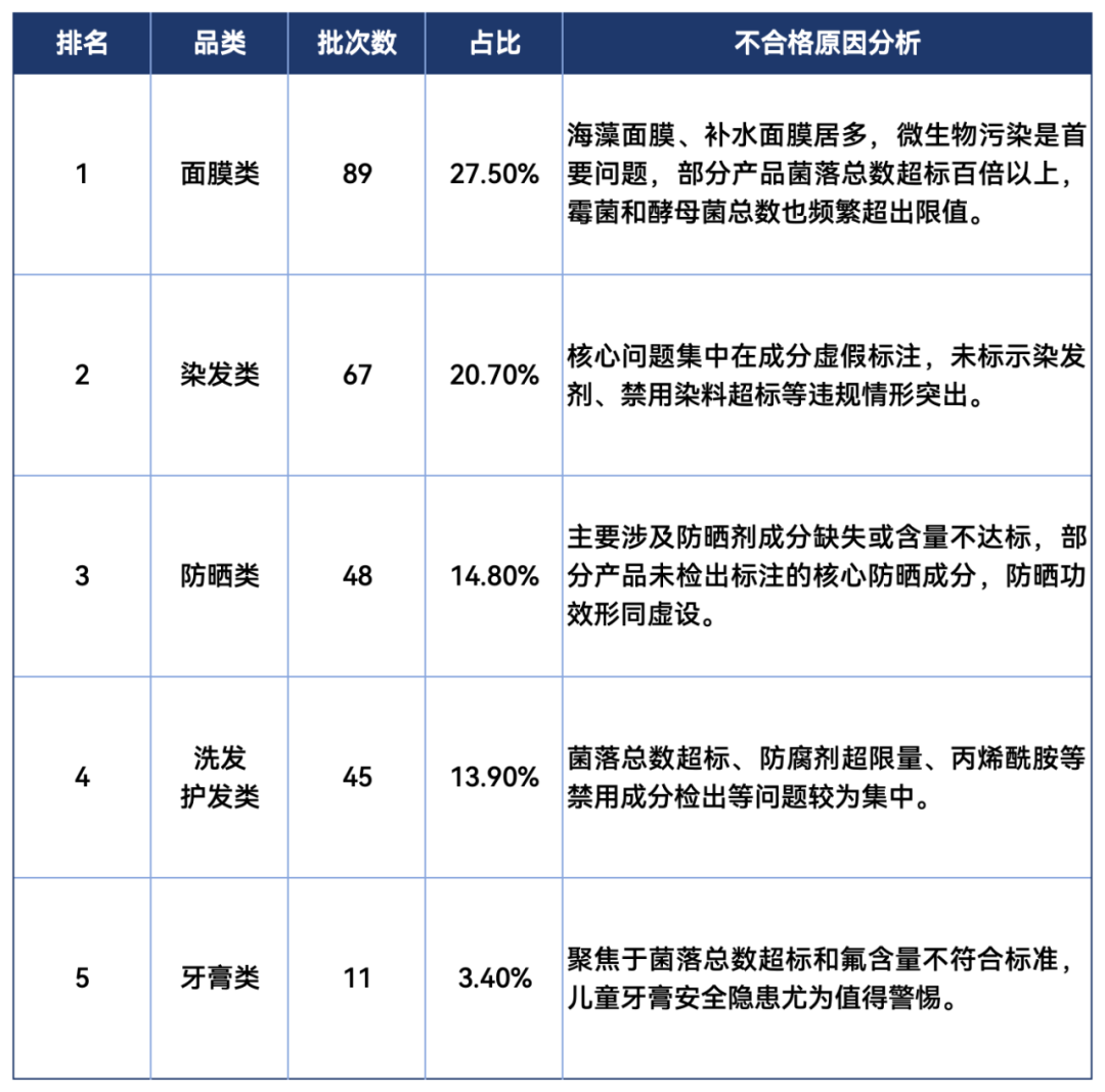 在这300余批次不合格化妆品中,我们可以观察到,以品类分布分析,不合格产品呈现显著集中特征,TOP5占比达总不合格批次的72.2%,反映出重点品类质量管控的紧迫性:
