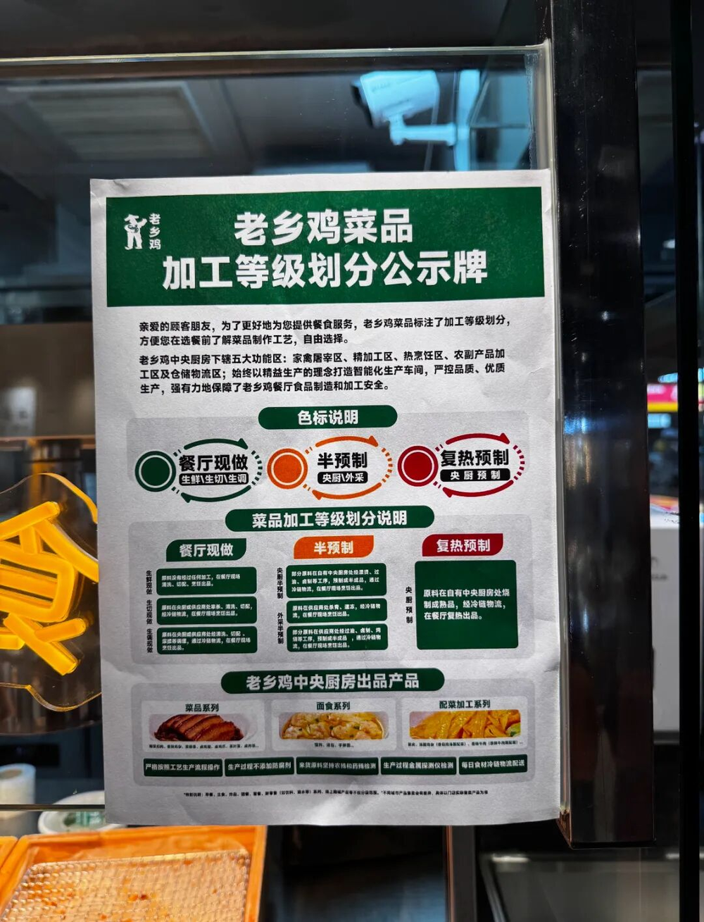 “老乡鸡”在门店直接标注现做、半预制、复热预制的加工等级