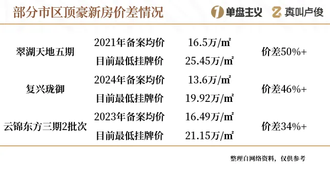 2021年备案价16.5万/㎡,如今挂牌价最低25.4万/㎡,单平差价近9万,涨幅超50%