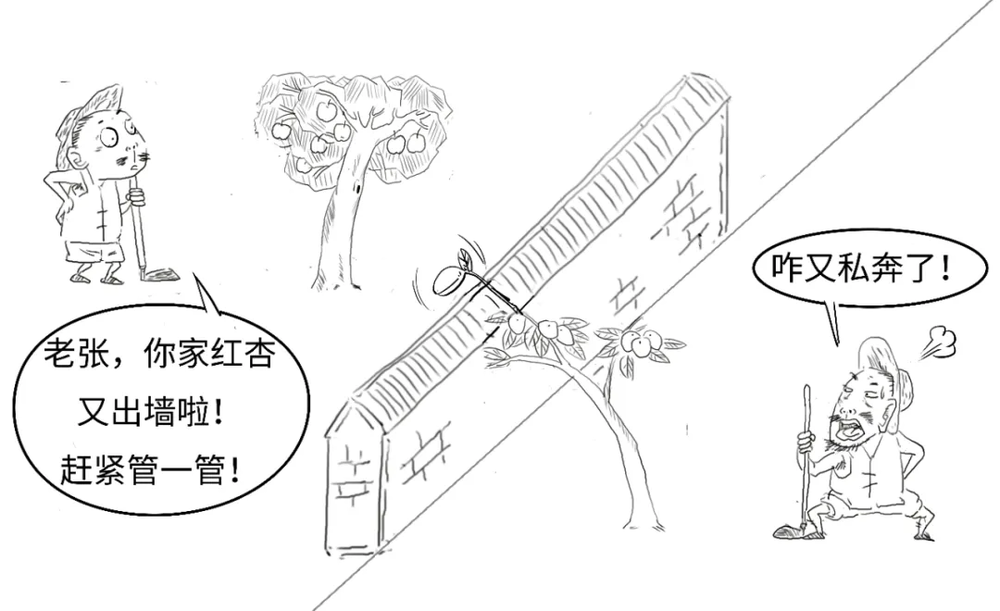 此时,老张家种的杏子树也遇到相同问题,杏子长到老王院子中来。