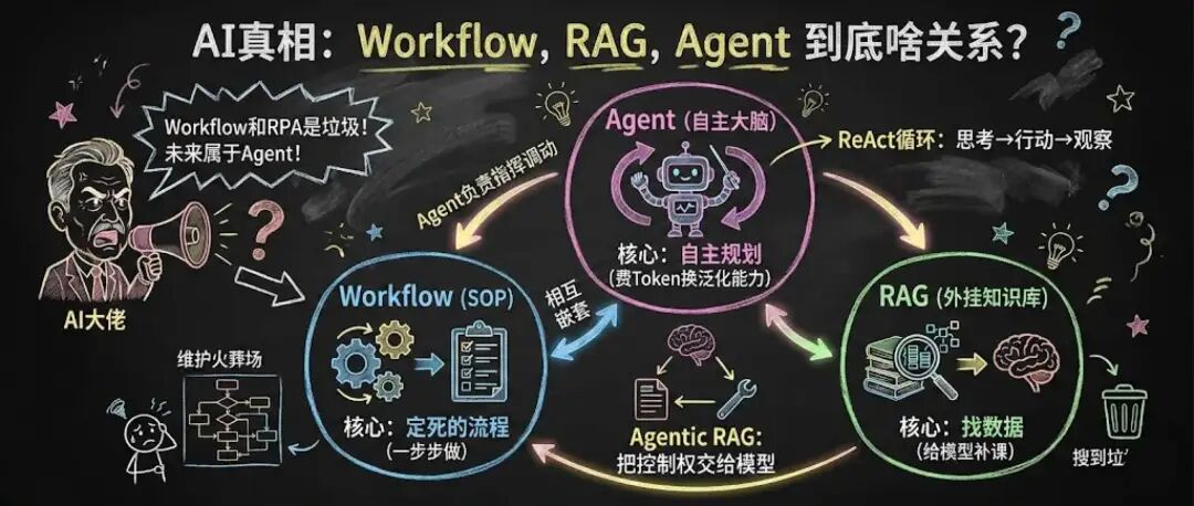 上周我们强调了Workflow的重要性,私下又有很多粉丝找过来,一定让我聊聊Workflow、RAG与Agent之间的关系,这一下就把我难住了,一个是这东西有撒好解释的?另一方面他们之间貌似没什么绝对的关系...
