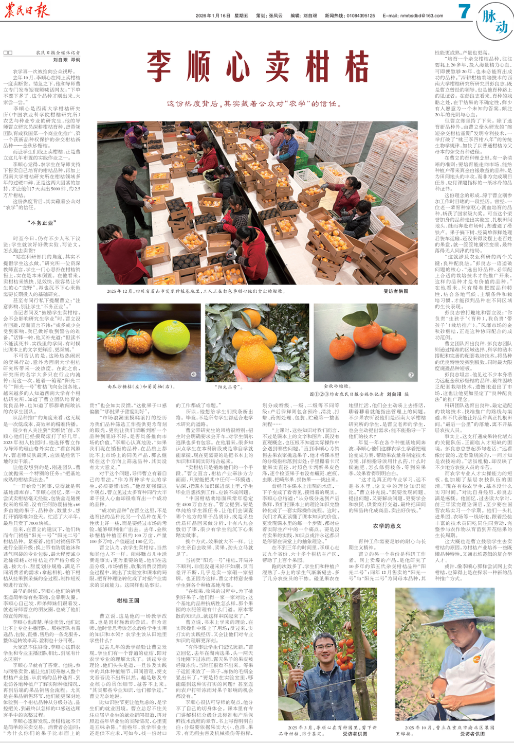 曹立认为,农学生卖柑桔,当然和其他人不一样。能够赚点儿生活费是事实;更为重要的是,他们在选品分级、市场销售、收集消费反馈的全过程中,跳出了实验室和课本的局限,把育种理论转化成了对接产业需求的实践能力。这同样也是事实。
