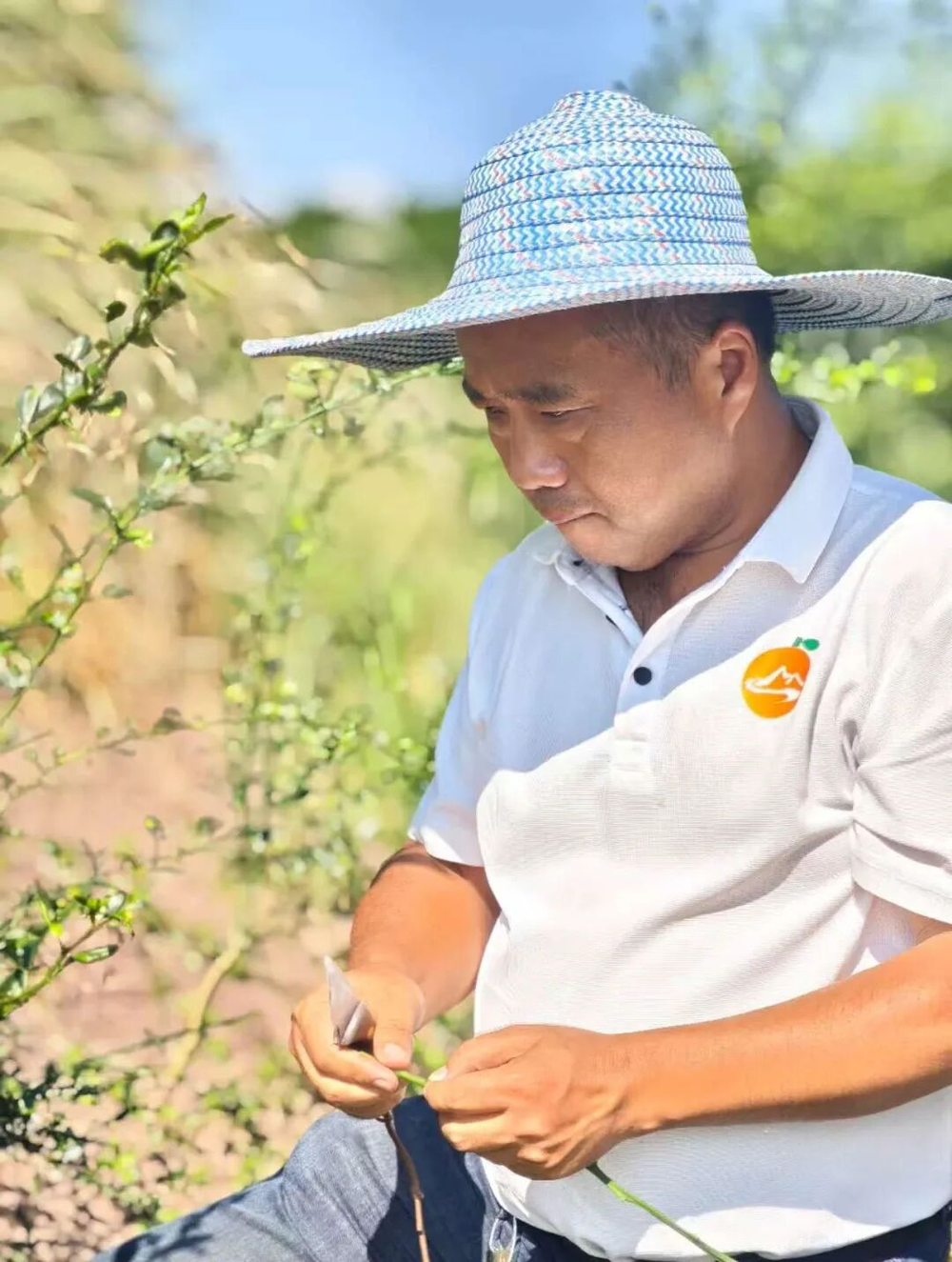 ▲2025年3月,李顺心在育种园里,剪下新品种柑桔,用于鉴定。 受访者供图