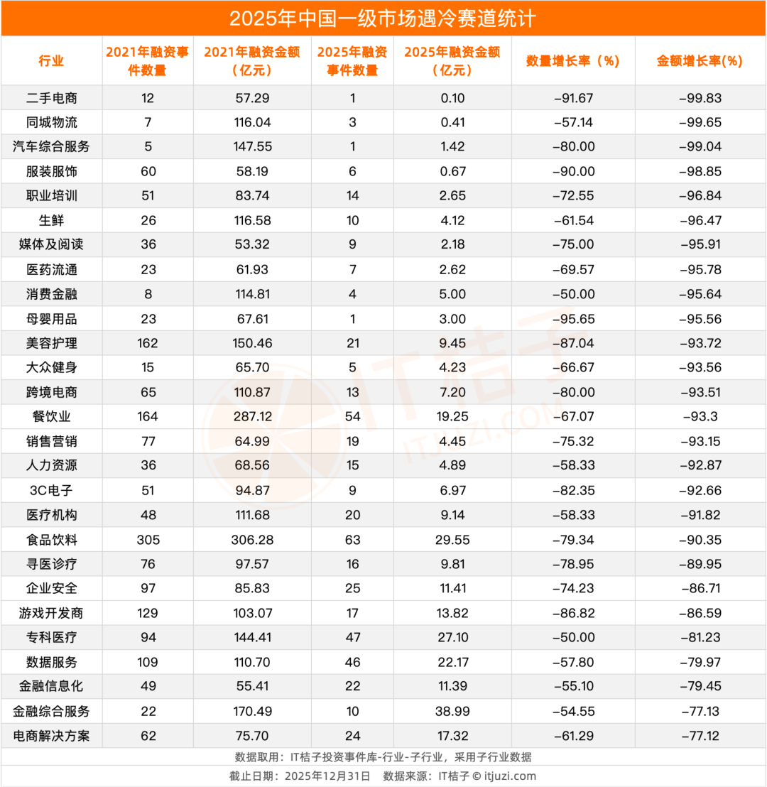 服装服饰(98.85%跌幅)、母婴用品(95.56%跌幅)和生鲜(96.47%跌幅)共同构成了消费降级浪潮下最惨烈的战场。2024年618全网销售额下降7%,一线城市餐饮收入下滑4.6-4.7%,消费者信心持续低迷。服装服饰从2021年的60起融资事件锐减至2025年的6起,母婴用品从23起降至仅1起,人口红利消退与消费收缩的双重打击,让这些赛道失去了增长的基本面。