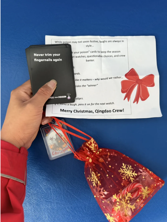 另外每个船员还有一枚船长+大副照片的钥匙扣,拐杖糖,恶搞扑克牌等小玩意儿。医生Louis扮演圣诞老人给大家发礼物,逗得大家哈哈大笑,然而圣诞午餐并没有升级,依旧是冷的火腿三明治。