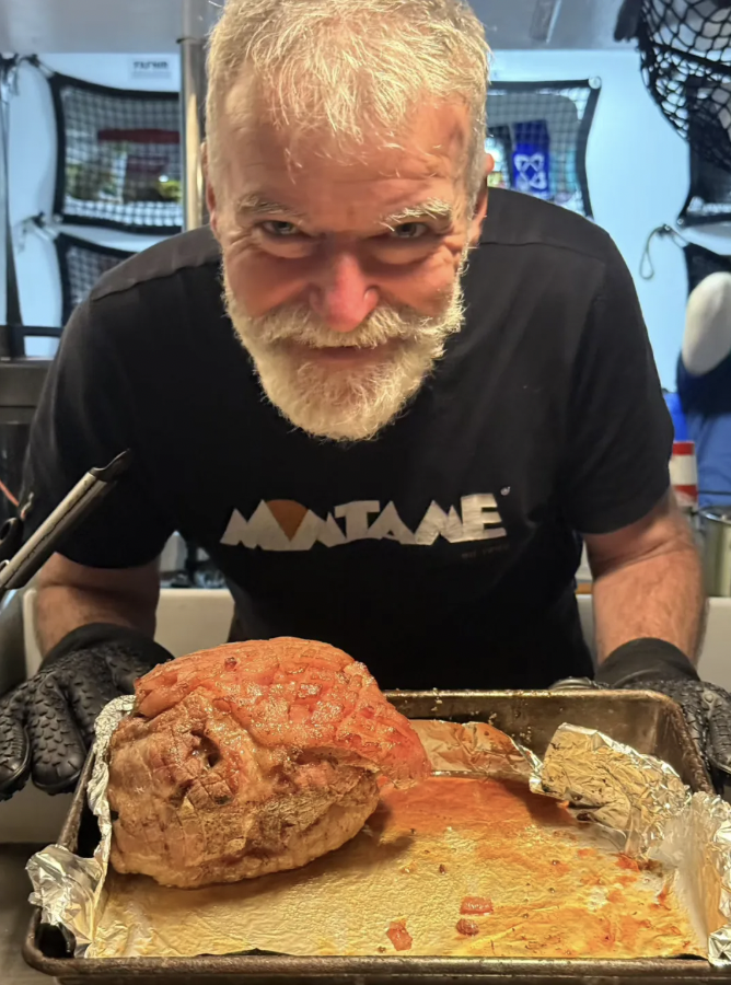 晚上,后备组把一块像金华火腿一样的咸肉火腿先煮后烤,再改花刀切开皮刷上蜂蜜放回烤箱继续加工,足足折腾了六个小时,我们终于吃到了“火腿土豆泥圣诞晚餐”,照我来说,这火腿吃起来和中午的罐头火腿味道没区别。