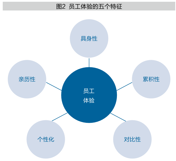 心理学和哲学领域有一个备受关注的新兴研究领域——具身认知,指的是“认知不仅发生在大脑中,更依赖于身体的感知、动作和与环境的互动”。也就是说,我们对世界的理解,不是单纯的“大脑思考”,而是依赖“身体经历”的塑造。简而言之,就是面前摆了一杯水,人们需要去触碰才能认识到它是热的还是凉的。在职场中也是如此,有些人认为好的公司,未必适合另一些人;备受赞誉的企业也总有人离职;有些人认为不好的公司对于另一些人来说恰恰是难能可贵的机遇。员工体验就是“如人饮水,冷暖自知”,一家餐厅的好坏要亲身经历以后才能得出认识。这就是员工体验的亲历性。员工体验的五个特征见图2。