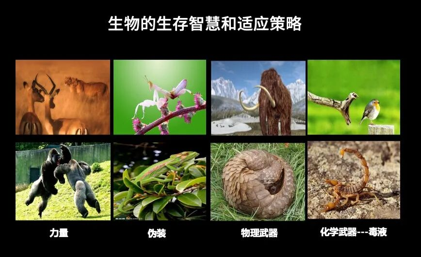 什么叫动物的生存适应策略?实际上我们所有的生物,包括植物、微生物,都有自己的生存智慧和策略。比如人靠大脑和聪明,狮子靠力量,变色龙靠伪装。
