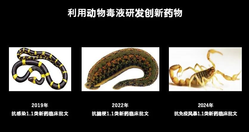 同时,我们还利用动物毒液最终来研发新药。这是我们团队这些年的一些工作:从2019年开始,从金环蛇、森林山蛭(西双版纳热带雨林里的陆生蚂蟥)找到抗脑梗药物。我们还从蝎子毒液里找到抗免疫风暴等药物。这一系列药物现在都正在做临床研究。