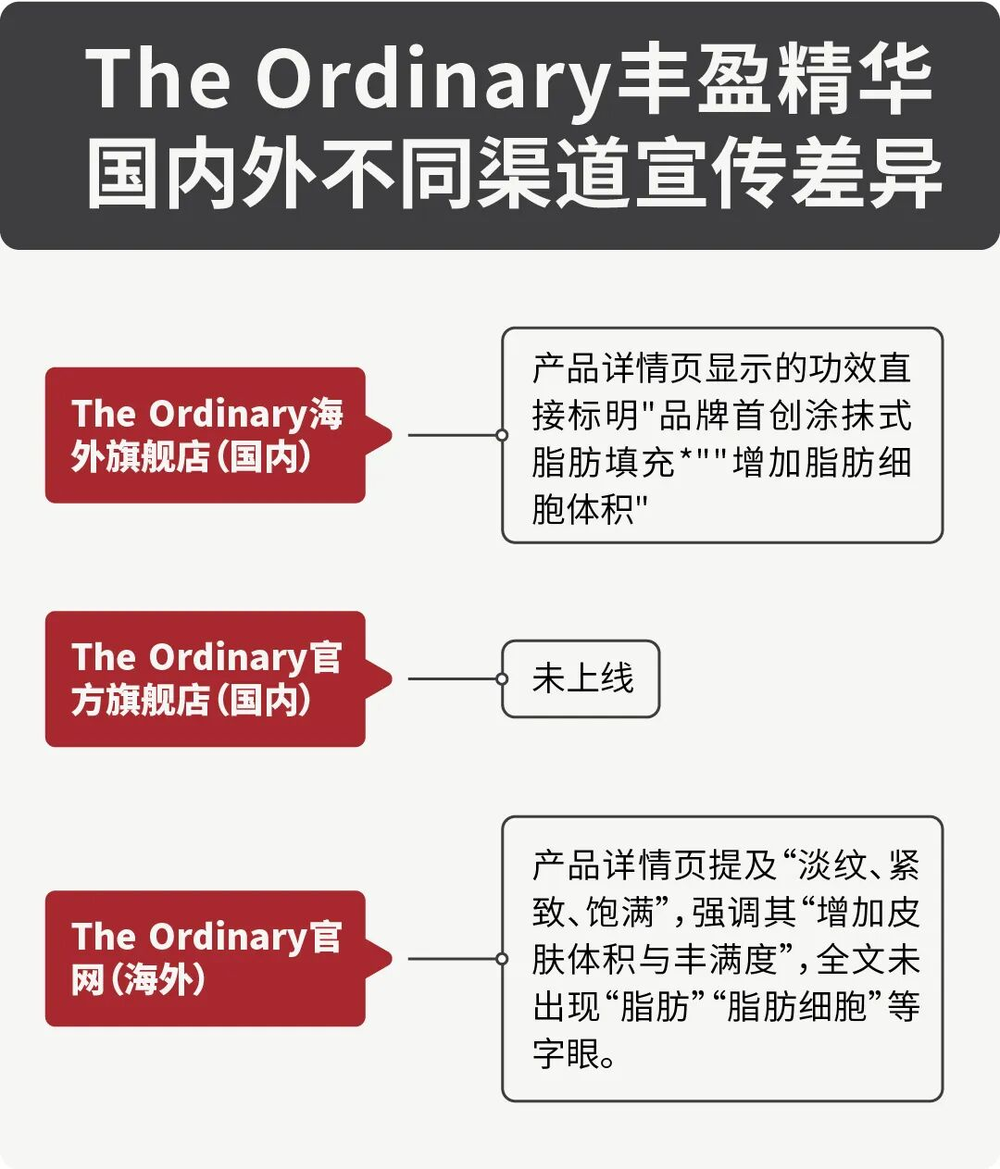 The Ordinary此次的“丰盈精华”在宣传策略上显然游走在合规边缘。“中外有别”的宣传文本、缺乏扎实人体实验支撑的功效主张、涉嫌违规的医疗词汇使用,均反映出品牌在营销与合规之间的摇摆。