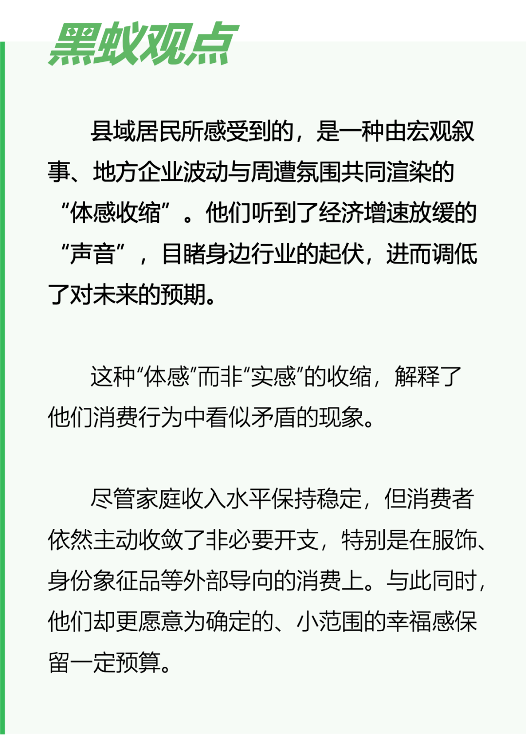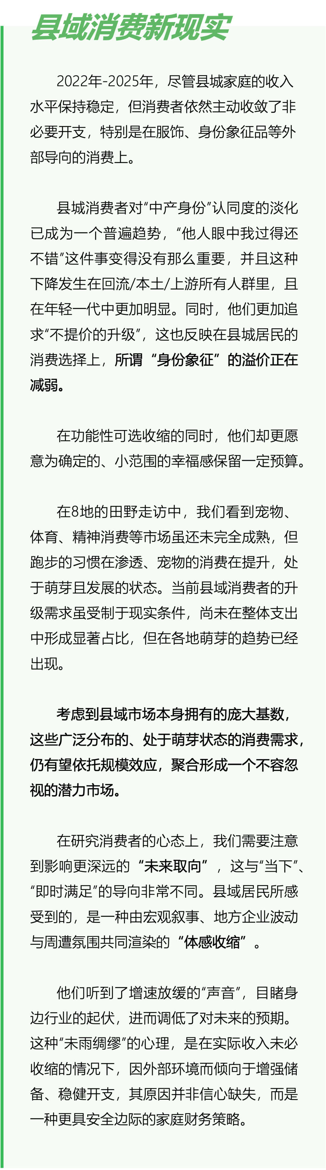 消费增长可能不会与收入增长完全同步,而是会更多流向那些能切实提升生活品质、缓解忙碌压力或增强本地生活归属感的商品与服务。未来县域市场的机遇,在于精准回应这种 “在谨慎乐观中,追求更优体验” 的普遍心态。