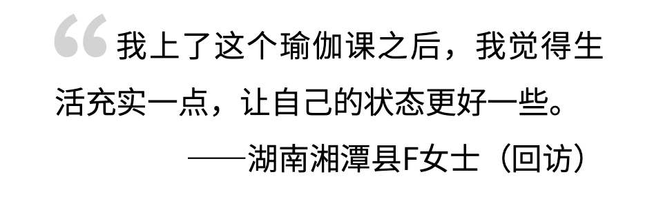 湖南湘潭县F女士的瑜伽则是从健康需求发展为情绪出口。她从2023年开始练习,最初因“脖子劳损”去体验,后来发现“练瑜伽后身体和精神状态都好多了”,现在基本把瑜伽当成“上班”一样坚持,每周4-5次。年卡1000多元,配合签到积分可抵扣年费,她认为“性价比高”。