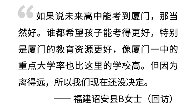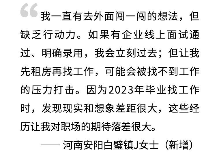 河南安阳县白璧镇的J女士是此次调研中最为年轻的受访者(20多岁),她成绩优异,在更大的城市学习与就业过,她接受过平权思想的影响,但就业市场的打击以及家庭内部父母的长期分工,让她觉得“自己永远也挣不到父亲的收入水平”。