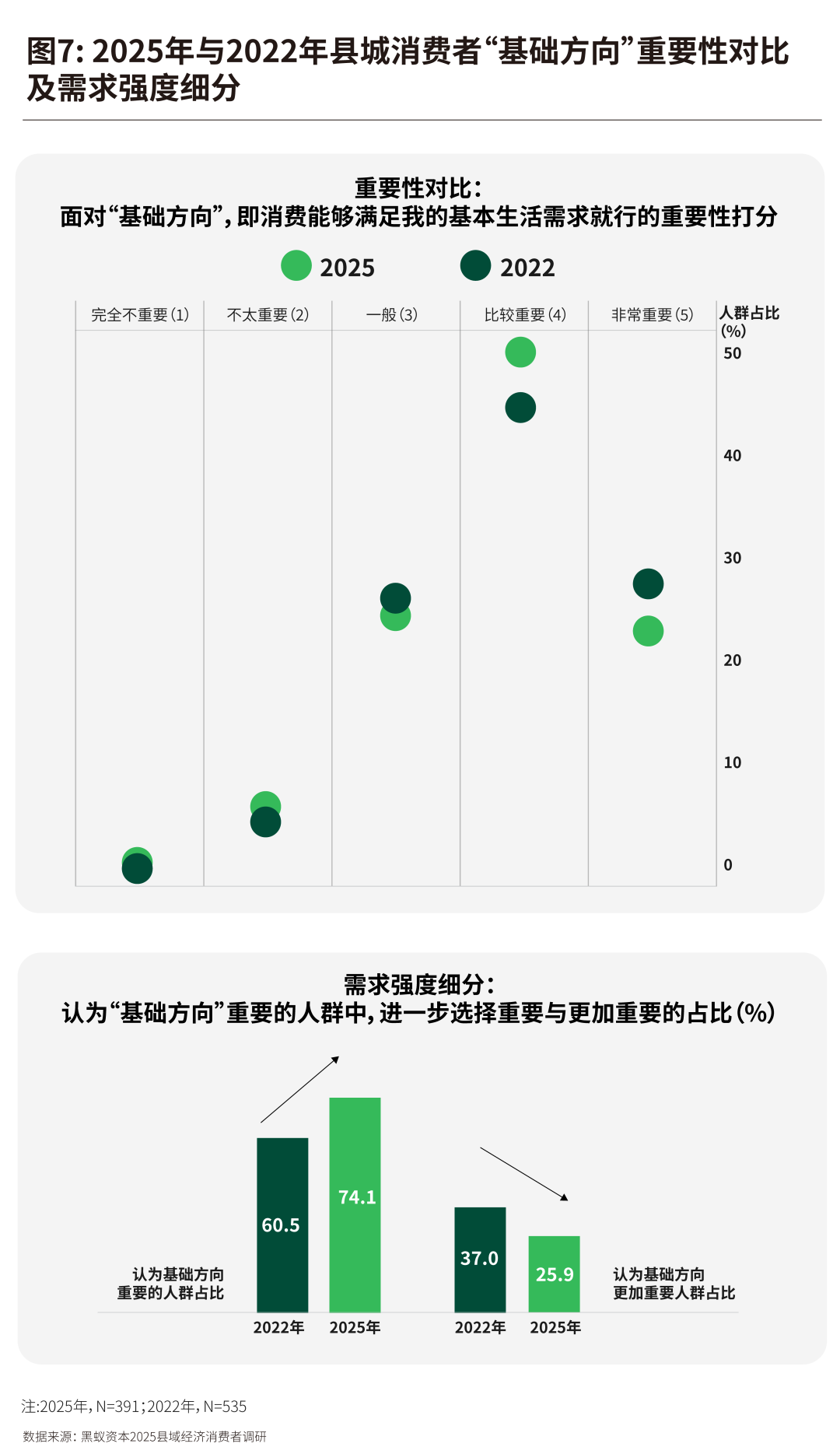 2025年与2022年相比,对于“消费能够满足我的基本生活需求就行”的态度来看,县城消费者认为消费的“基础功能”属性虽仍是基石,但其边际重要性正在下降。约11%的消费者从认为“更加重要”转而认为“重要”,这说明消费的“基础功能”属性已出现趋势性的弱化,即没那么重要了。