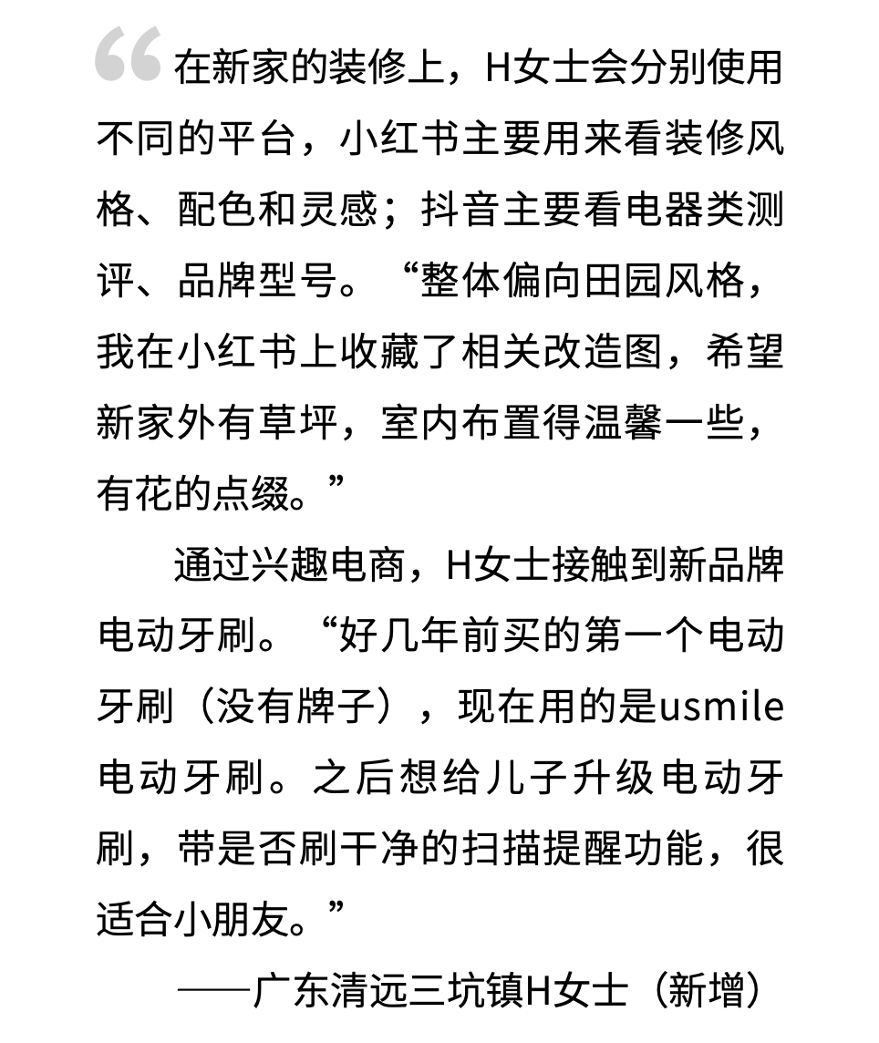 在社交媒体与电商的充分渗透下,许多改善型需求已在县域发生。在县域走访调研中,我们发现电动牙刷、九阳空气炸锅、坚果投影仪等产品已进入不少县域的家庭,社交媒体持续教育“精致生活”的具体形态,或许增加了渗透的潜力。