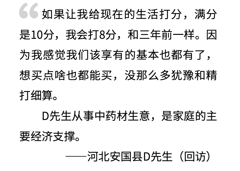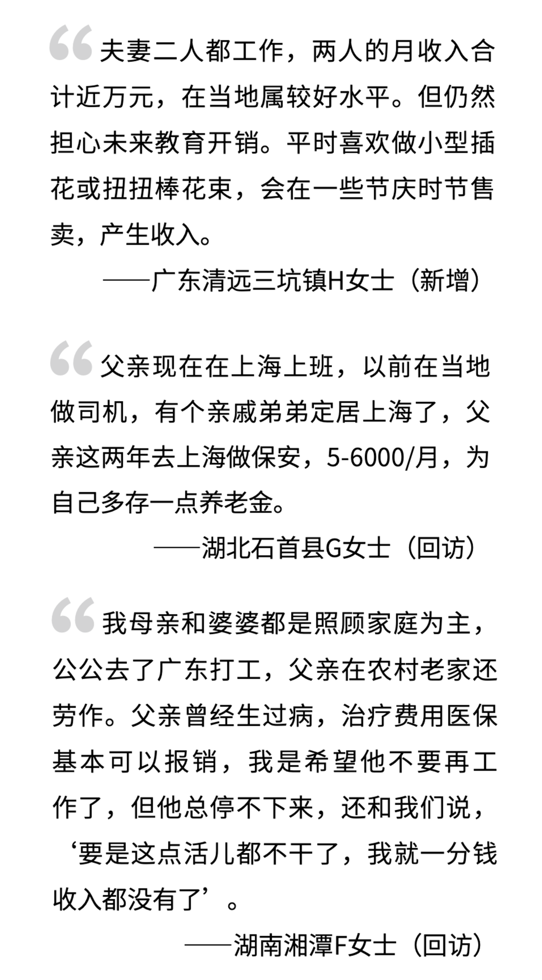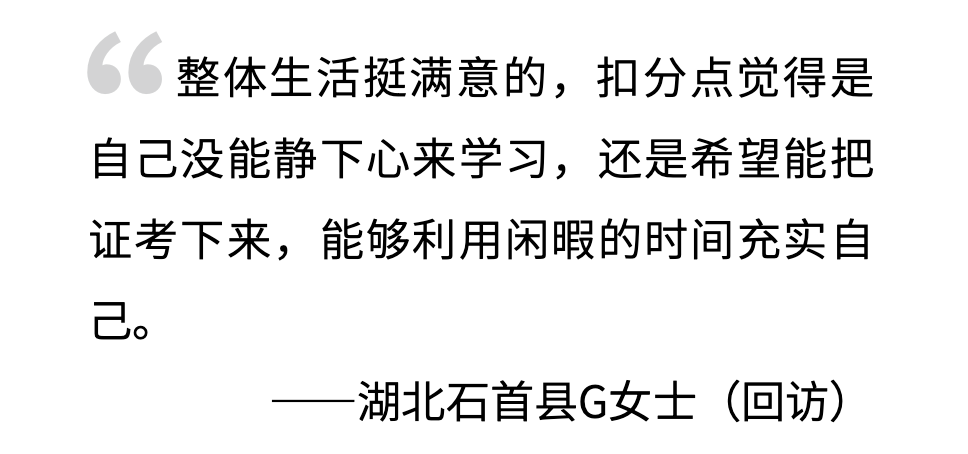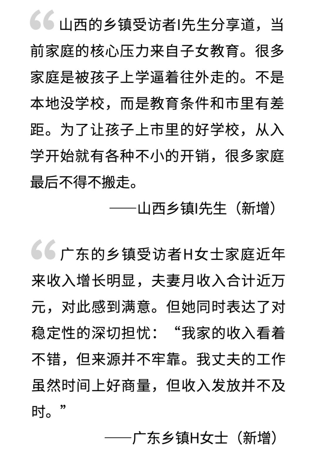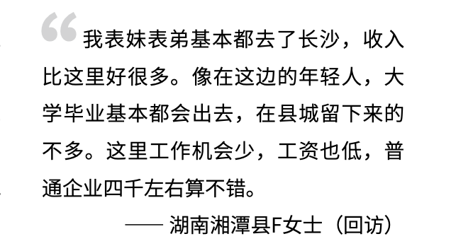 同时作为流动的起点,我们在田野调研中能够看到当前乡镇居民的生活呈现出一种满足现状与寻求发展并存的状态。他们的生活与家庭紧密关联,生活成本较低,但在收入、职业发展和社会资源方面面临普遍性的限制。
