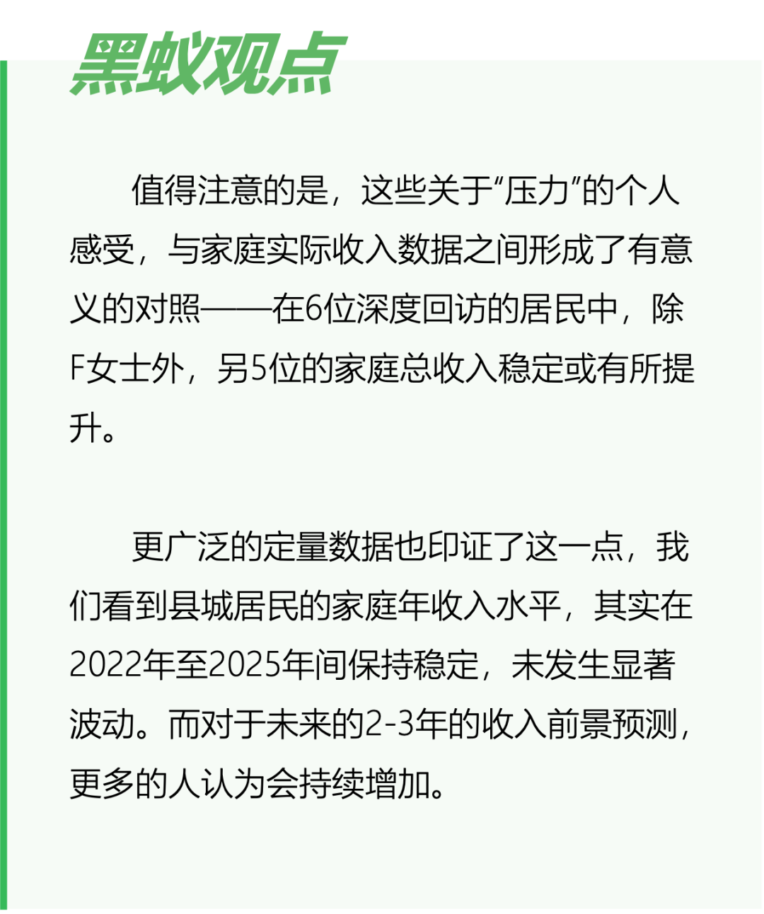 在2025年黑蚁资本县域消费者调研中,为深入探究不同层级市场的消费特征,调研特别覆盖了县城主城区-乡镇这两个关键层级:其中县城主城区样本占比70%(700份),乡镇样本占比30%(300份)。并在田野调研中新增3位乡镇受访者,与6位县城回访者共同构成了一组有益的对比。