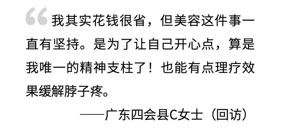 广东四会县C女士的美容院支出保持月均1000-1200元,被她强调为“唯一的精神支柱”。她坦言: