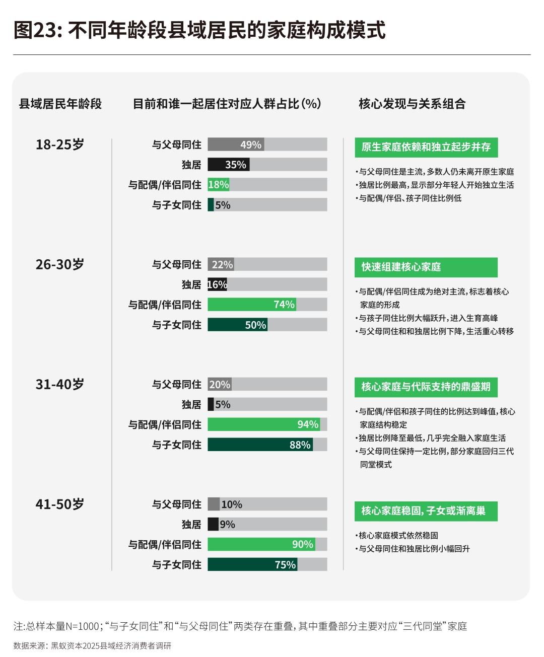 在分析县城消费者需求的影响因素时,2022年的研究主要归因于两大动因:一是家庭生命周期所处的阶段,二是居民的人口流动属性(如回流、本土、上游/前农村等类别)。但2025年的研究中,我们看到这一驱动结构正在发生变化。