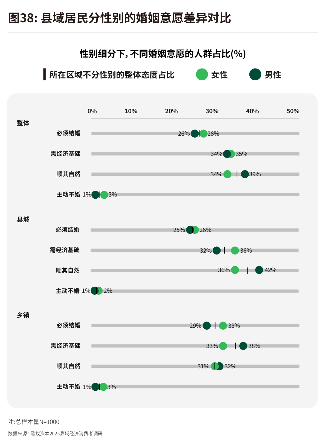 乡镇的环境中,认为“必须结婚”的传统压力(男29.2%,女32.9%)都高于县城水平,乡镇男性展现出更深的经济焦虑,对“需要经济基础”的诉求(37.7%)最为强烈,高于女性。但乡镇女性“主动选择不结婚”的比例(2.9%)是男性(0.8%)的三倍有余。