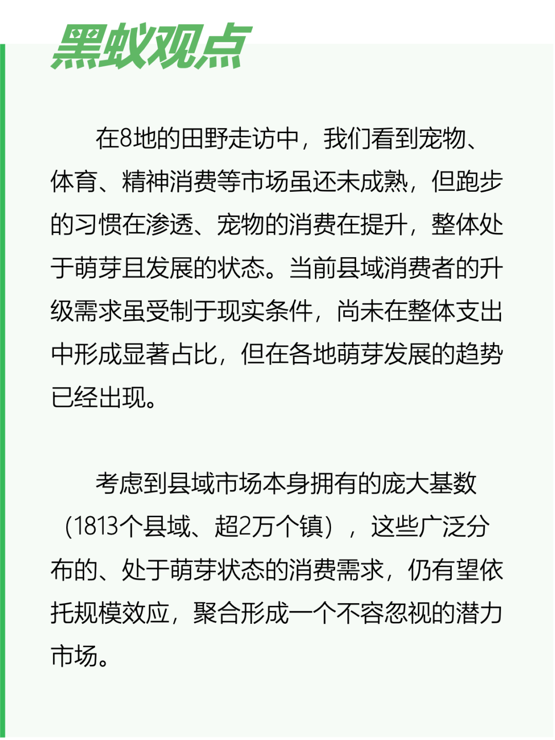 黑蚁关注商业机会与投资启示,县域市场的广阔与折叠是我们长期跟踪的趋势性机会,但我们更深层的兴趣在于人的变化与社会的变迁。