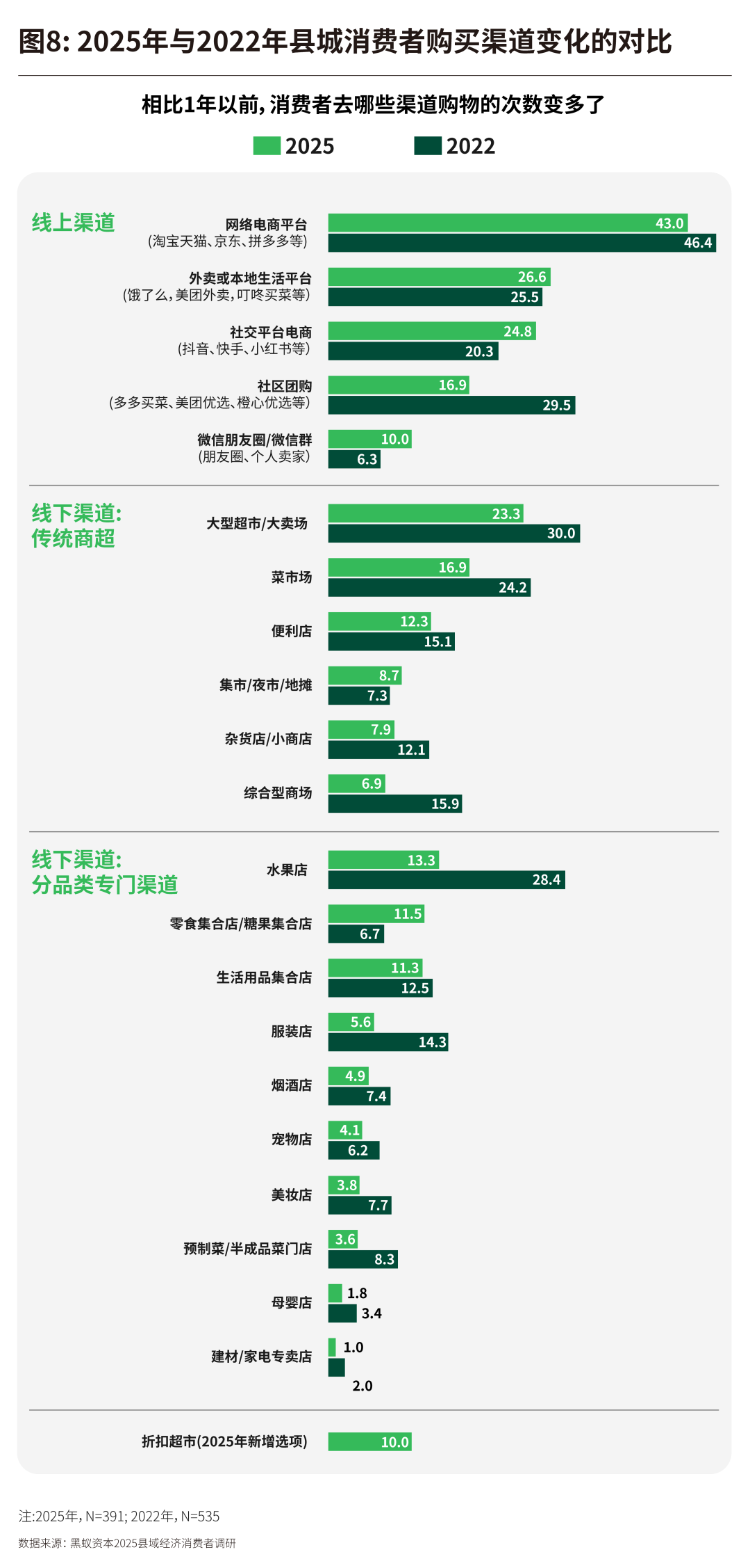 传统零售业态普遍面临客流分散,更多地去菜市场与综合型商场的县城消费者比例均有回落,显示出其作为主流消费空间的吸引力正在减弱。
