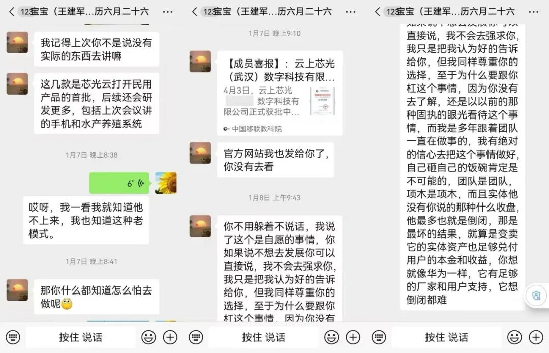 他说得很自信,杨雯珍相信了。后来,杨雯珍才发现,王建军不是普通的投资者,而是芯光云的“执行官”,是群里发红包的那个人。
