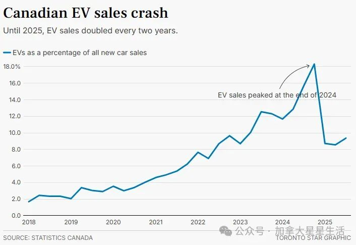 从市场占比来看,加拿大电动车在2024年12月一度占新车销量的18%,但在2025年,这一比例被“腰斩”至不足9%。