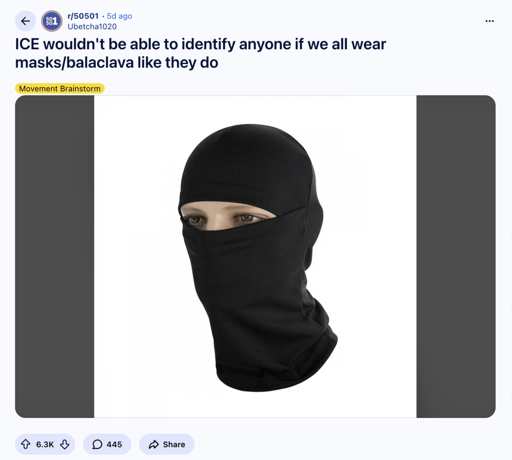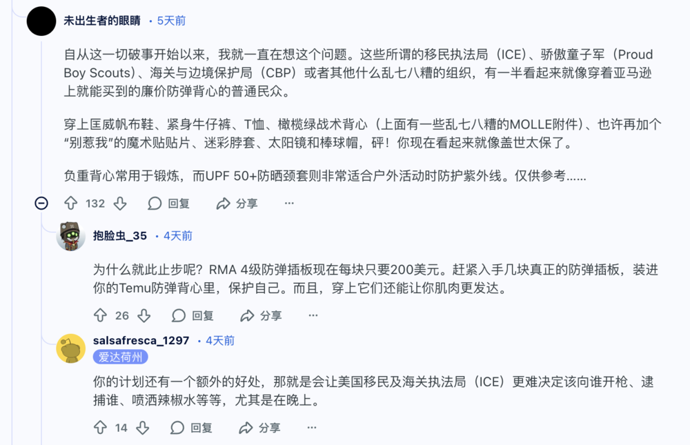 于是,聪明人开始遵从那两句老话:打不过就加入,最危险的地方就是最安全的。一些民众开始呼吁自己街道遵守新的Dress Code,直接穿成ICE的样子。