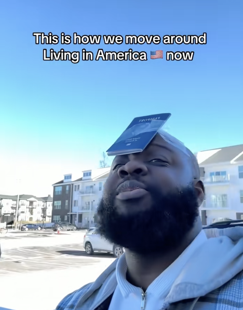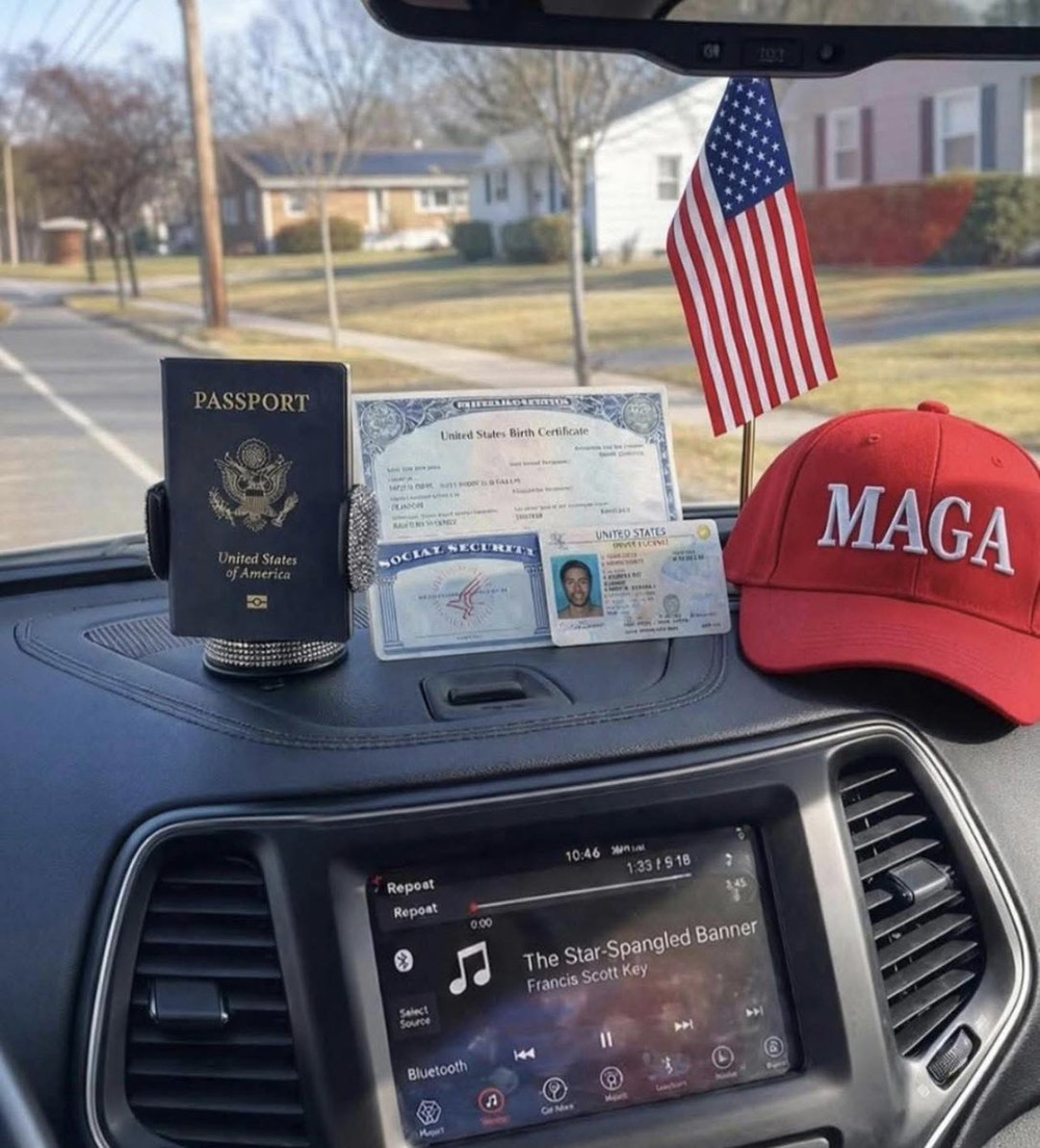 “去上班的美国人be like:在车里摆上美国护照、美国出生证明、美国国旗、社会安全卡和驾驶证、MAGA卡车帽,同时循环播放美国国歌。”