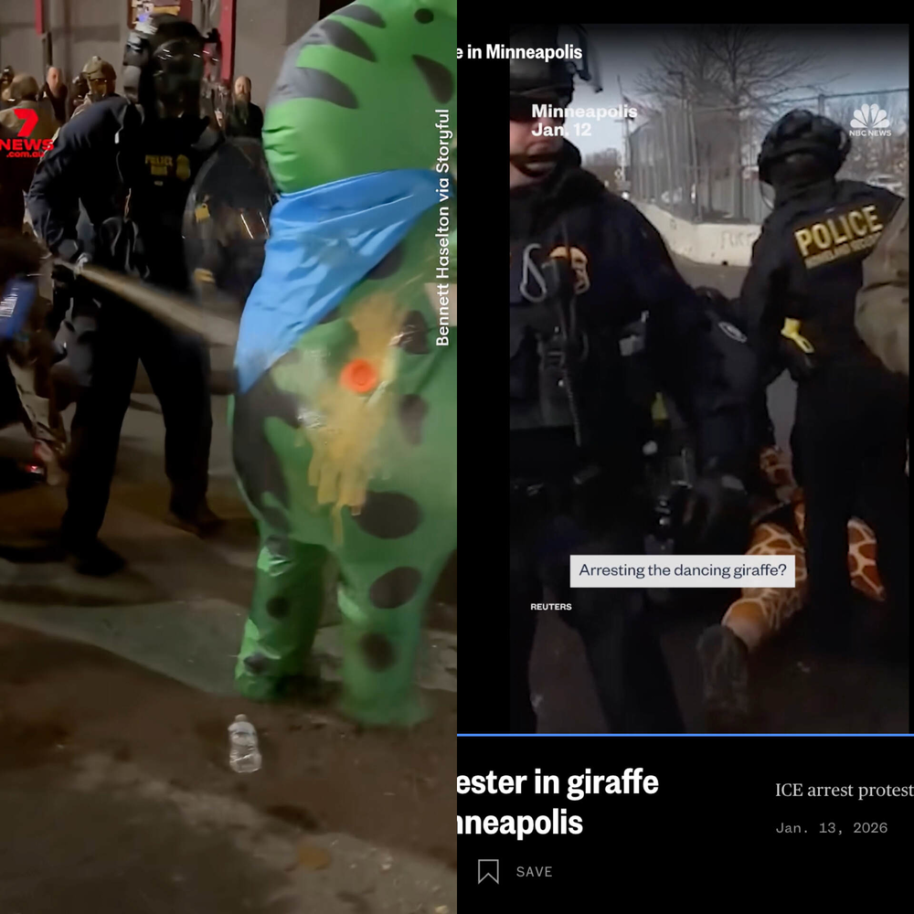 有点好笑的是,他们似乎对奇装异服有特殊偏好。一部分人对玩偶服表现出了异常的攻击力。视频显示,他们不仅在充气青蛙服的换气口狂喷胡椒喷雾,甚至还联合压倒了一只跳舞的长颈鹿。