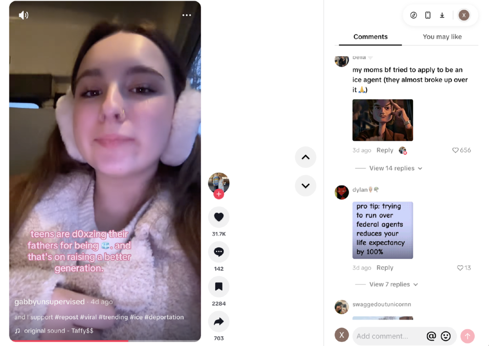 一些Z世代或者更年轻的人们也在网上呼吁同龄人d0xzing(网络词,即人肉搜索)自己在ICE的爸爸们,并把他们的人脸、姓氏和具体信息po到网上。