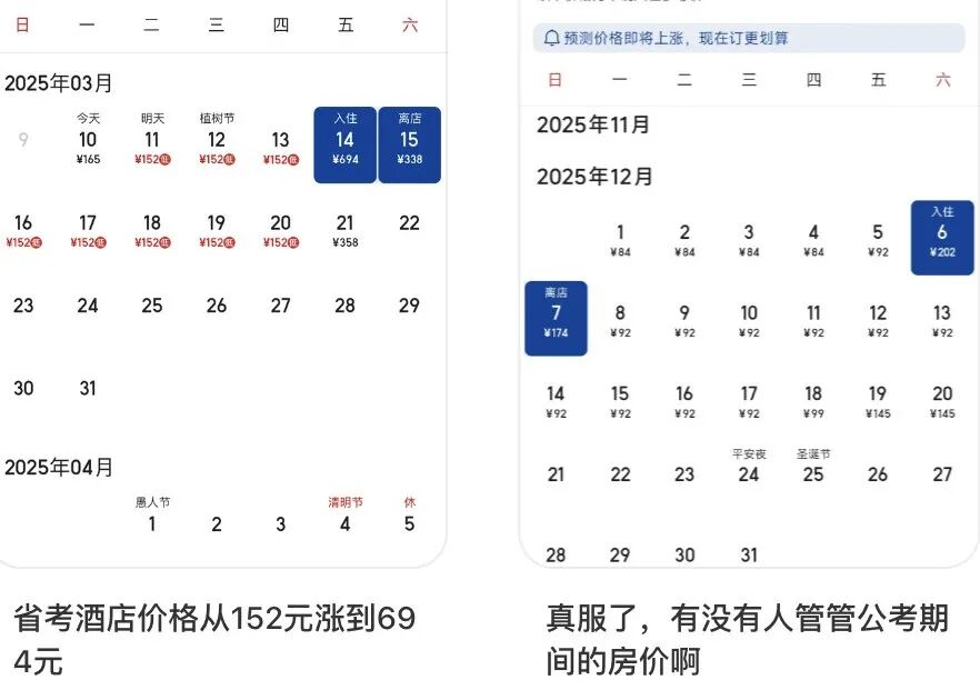 订酒店的时候,章琳发现考试前和考试当天的酒店价格几乎是日常价格的2倍还多。