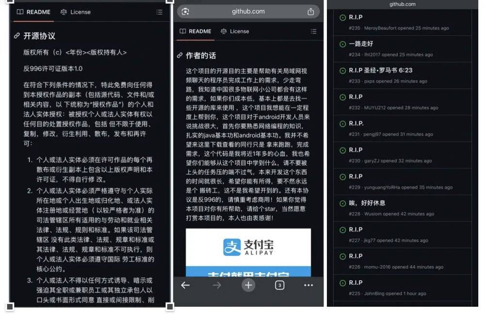 高广辉的GitHub开源项目,曾贴出了“反996”的标签,也希望自己的代码能够帮助同行们,“请不要被上头任务压的喘不过气……希望你能有所得,不然永远是个搬砖工”。现在,则被无数前来悼念的R.I.P刷屏。