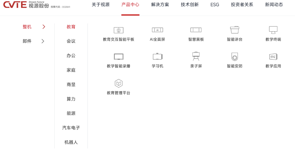 打开视源科技的官网,是一条涵盖了教育、办公、商显、算力、能源、汽车电子和机器人的庞大产品线。