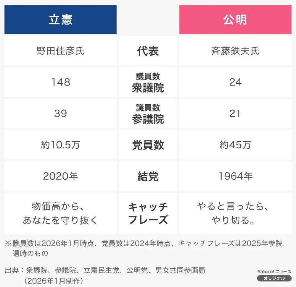 两家也都发现,如果再单打独斗,只会被高市的右翼洪流彻底冲垮。于是他们为了生存和相互壮大,选择抱团取暖。据专家分析,立宪民主党有全国候选人网络的优势,而公明党则有强大基层支持,每个选区都能拉到至少1万张选票。换句话说,立宪可以出人,公明则可以出票。