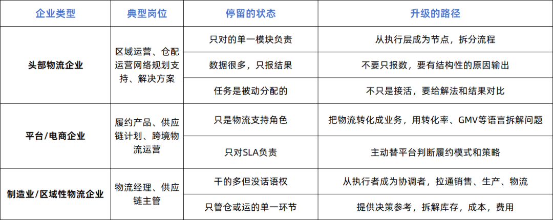 如果你的所在公司没有倒、业务还在跑,领导还愿意分活给你,其实说明你还在体系内。但问题是,体系内并不等于有上升空间。很多物流人卡在同一个岗位三五年,并不是能力不行,而是定位一直停留在执行层。你不能再把自己当工具人,而是开始把自己当做业务的核心节点。这点在不同类型企业里,表现方式并不一样(见总结表格)。