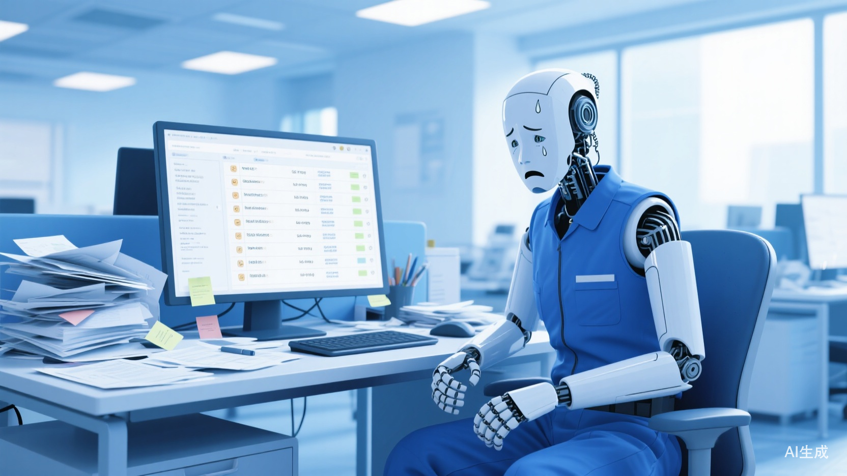 更多人得到的是压力山大的画面。机器人满头大汗,被任务清单包围,表情有咱们职场社畜的那种疲惫感。
