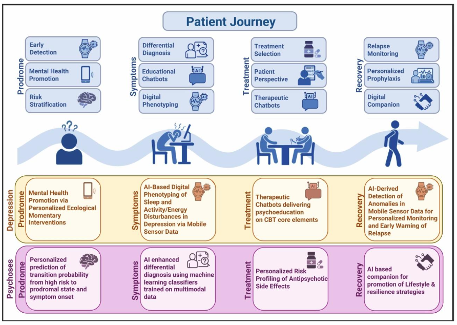 早期检测(旅程起点):通过可穿戴设备监测亚临床信号,比如情绪波动、睡眠异常,提前预警风险(比如自杀倾向、抑郁症复发);