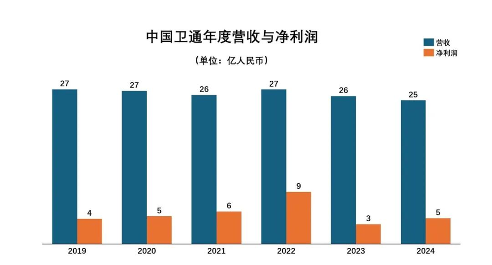 但是,尽管中国卫通在资质、资源、运营能力上优势显著,其近6年的业绩表现却一直平平:年度营收长期稳定在26亿元左右,从未突破30亿元,盈利水平低于10亿元,与垄断地位严重不符。