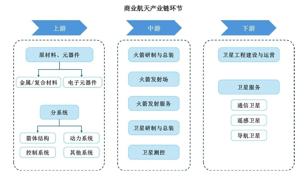 完整的商业航天产业链可划分为上游基础装备(材料、元器件等)、中游卫星制造与火箭发射、下游卫星工程建设与运营三大核心环节,其景气度呈现“下游牵引中游、中游带动上游”的传导逻辑。。